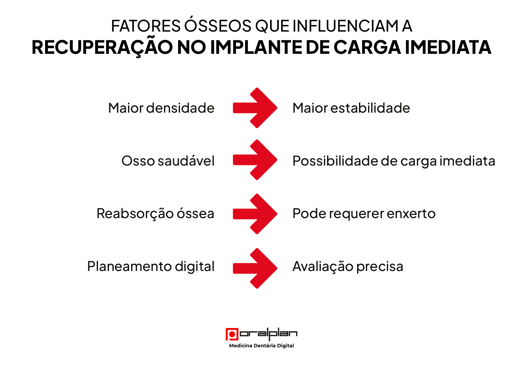 A qualidade do osso é um dos fatores mais importantes na decisão clínica e na recuperação após um implante de carga imediata. Uma maior densidade óssea permite obter melhor estabilidade inicial do implante, o que aumenta a segurança da carga imediata. Quando o osso é saudável e apresenta bom volume, existe maior previsibilidade na cicatrização e na adaptação da prótese provisória.