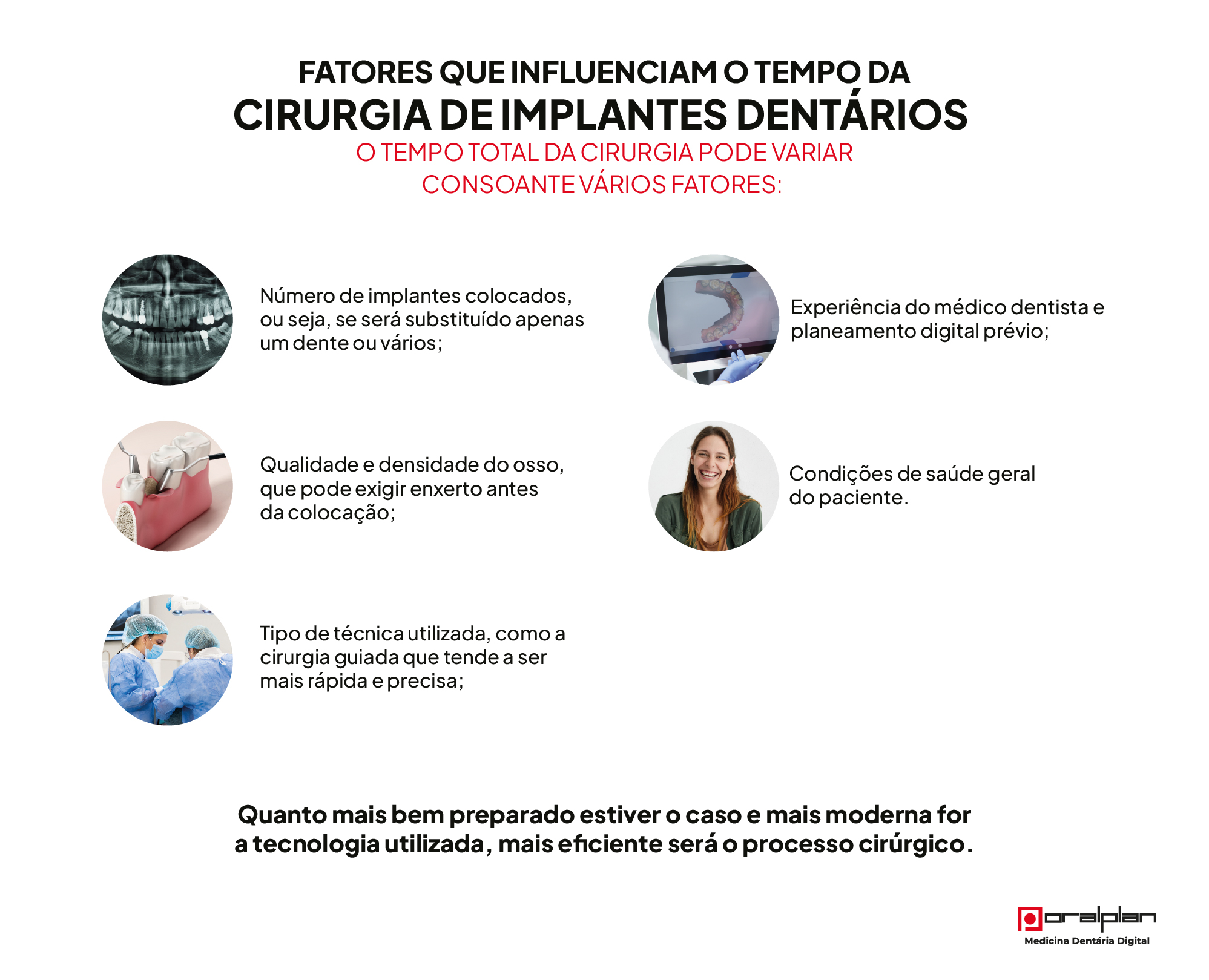 De forma geral, a colocação de um implante dentário é um procedimento simples e rápido. Em média, a cirurgia dura entre 30 minutos e 2 horas, dependendo do número de implantes e da complexidade do caso.