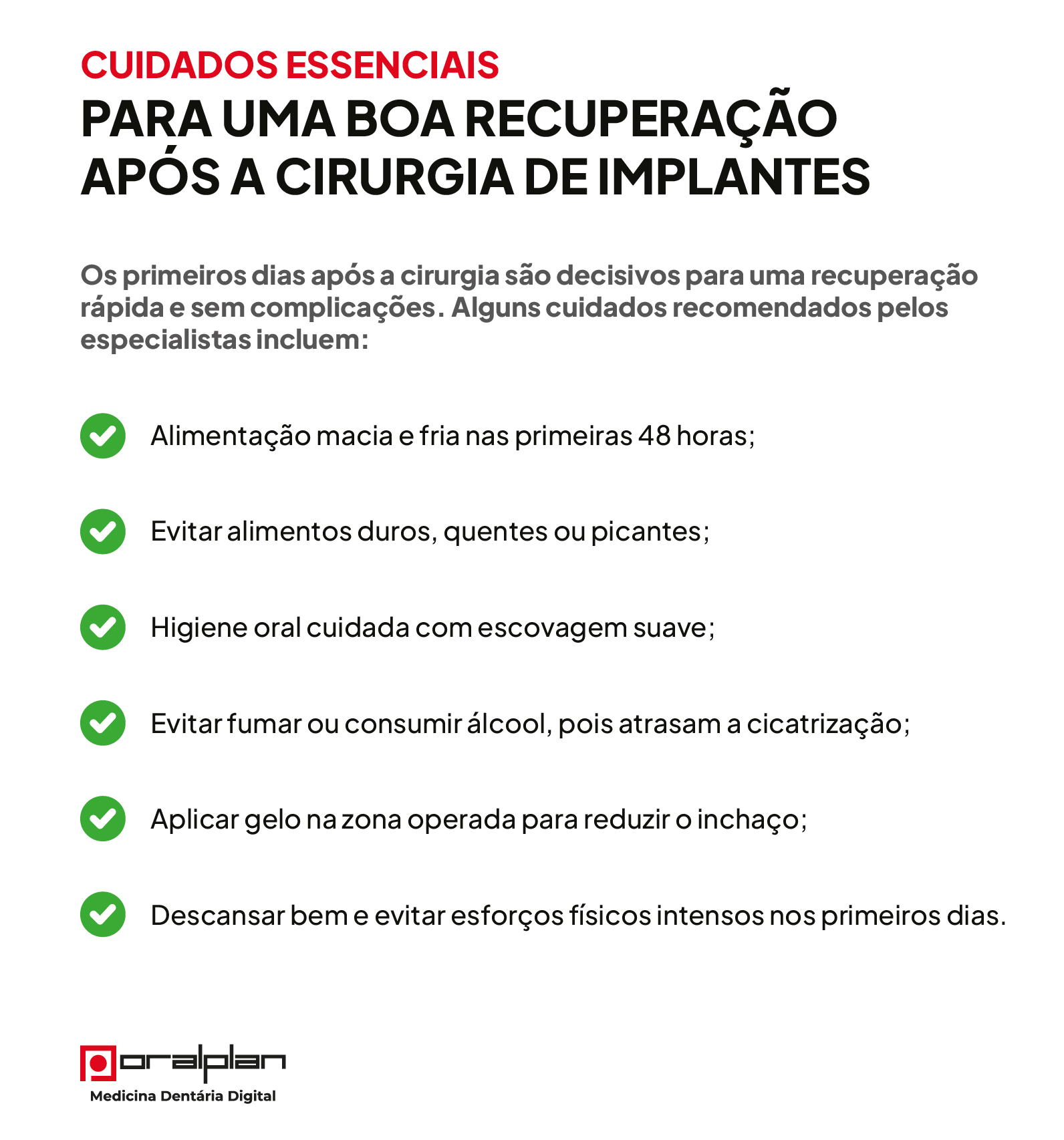 Nos casos de carga imediata, em que o implante recebe um dente provisório no mesmo dia, o acompanhamento clínico é rigoroso. Ainda assim, o conforto é elevado e a maioria dos pacientes relata pouco ou nenhum desconforto após as primeiras 24 horas.
