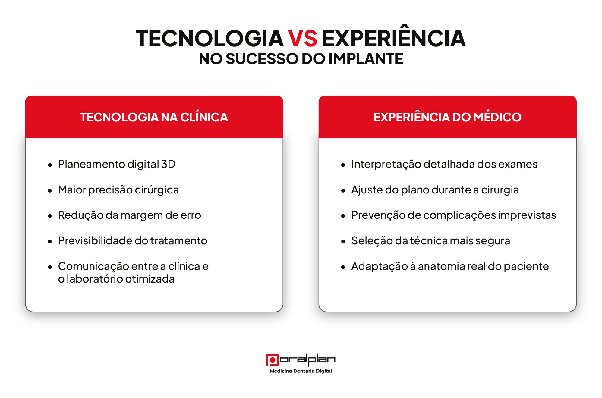 A tecnologia tem um papel fundamental no sucesso dos implantes dentários, oferecendo planeamento digital 3D, maior precisão cirúrgica e uma redução significativa da margem de erro. Permite ainda uma melhor comunicação entre a clínica e o laboratório, tornando o tratamento mais previsível. No entanto, é a experiência do médico que transforma esses recursos em decisões clínicas seguras. Só um profissional experiente consegue interpretar corretamente os exames, ajustar o plano durante a cirurgia, prevenir complicações imprevistas e escolher a técnica mais adequada à anatomia real de cada paciente. Assim, tecnologia e experiência trabalham lado a lado: a primeira oferece ferramentas avançadas; a segunda garante que estas são utilizadas com rigor e discernimento, assegurando resultados consistentes e duradouros.