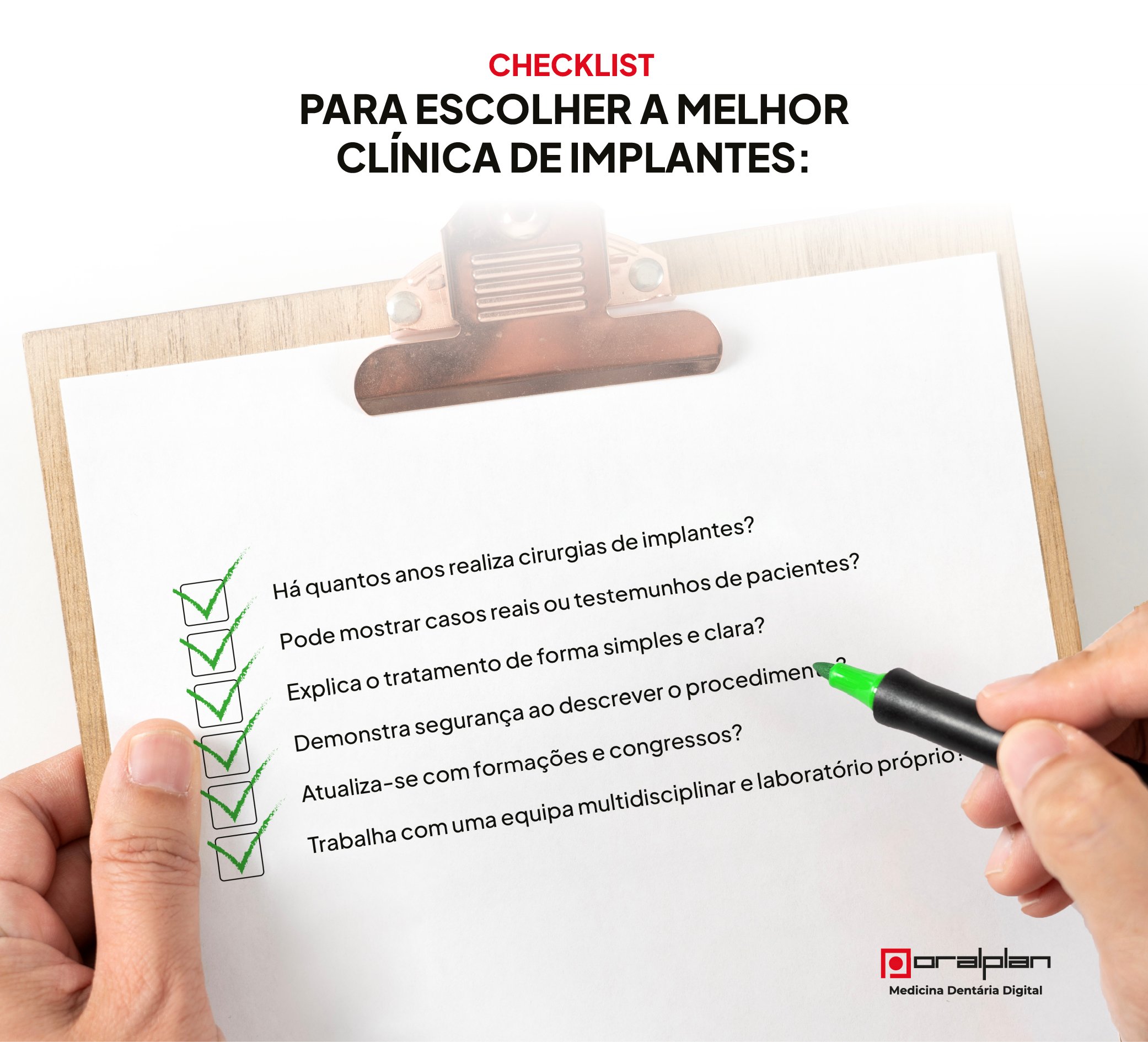 Ao escolher uma clínica de implantes dentários, procure um profissional com experiência comprovada, capaz de explicar o tratamento de forma clara e segura, apresentar casos reais e demonstrar atualização contínua através de formações e congressos. É também importante que trabalhe com uma equipa multidisciplinar e, idealmente, com laboratório próprio, garantindo maior precisão e controlo em todas as etapas do tratamento.