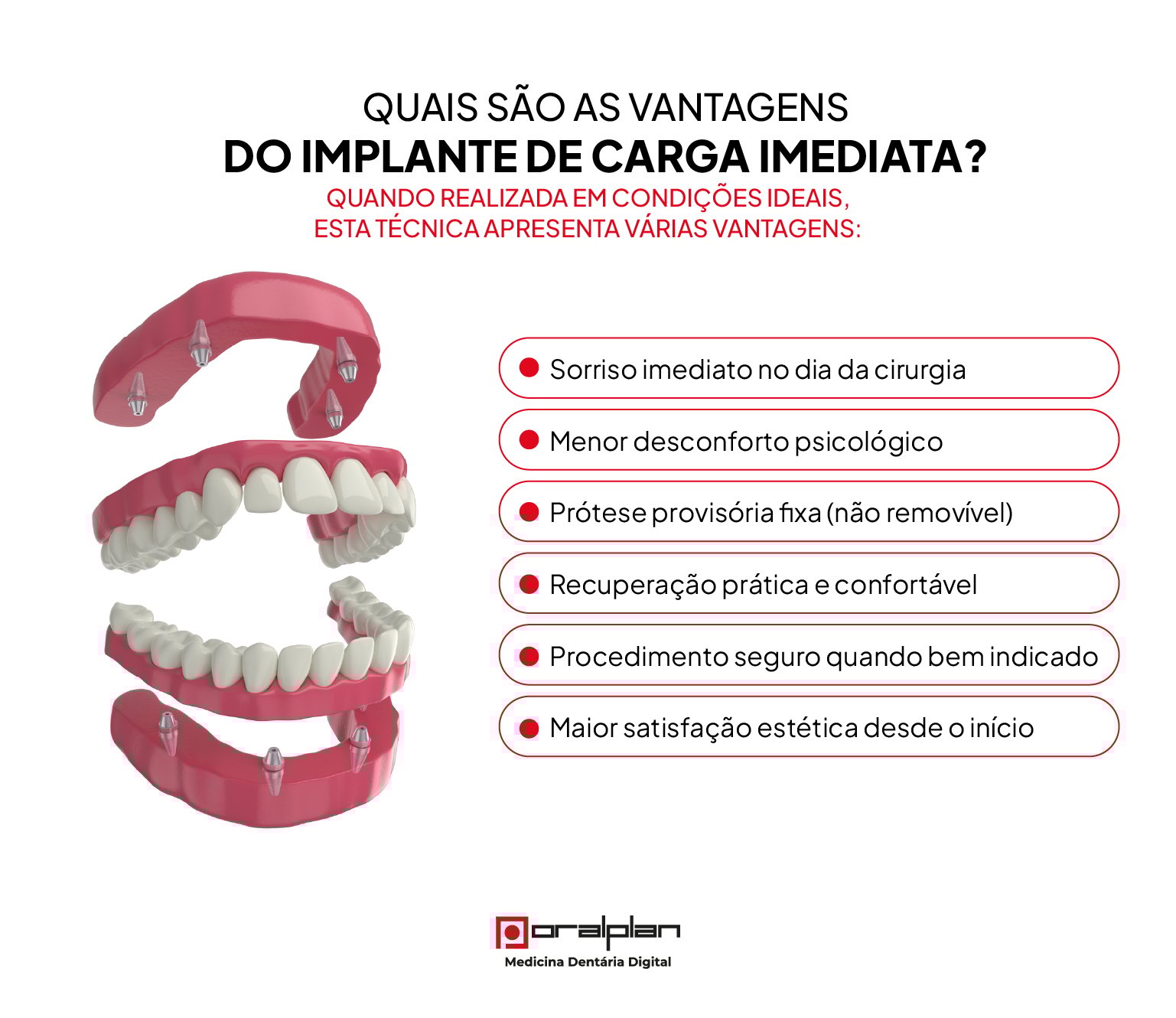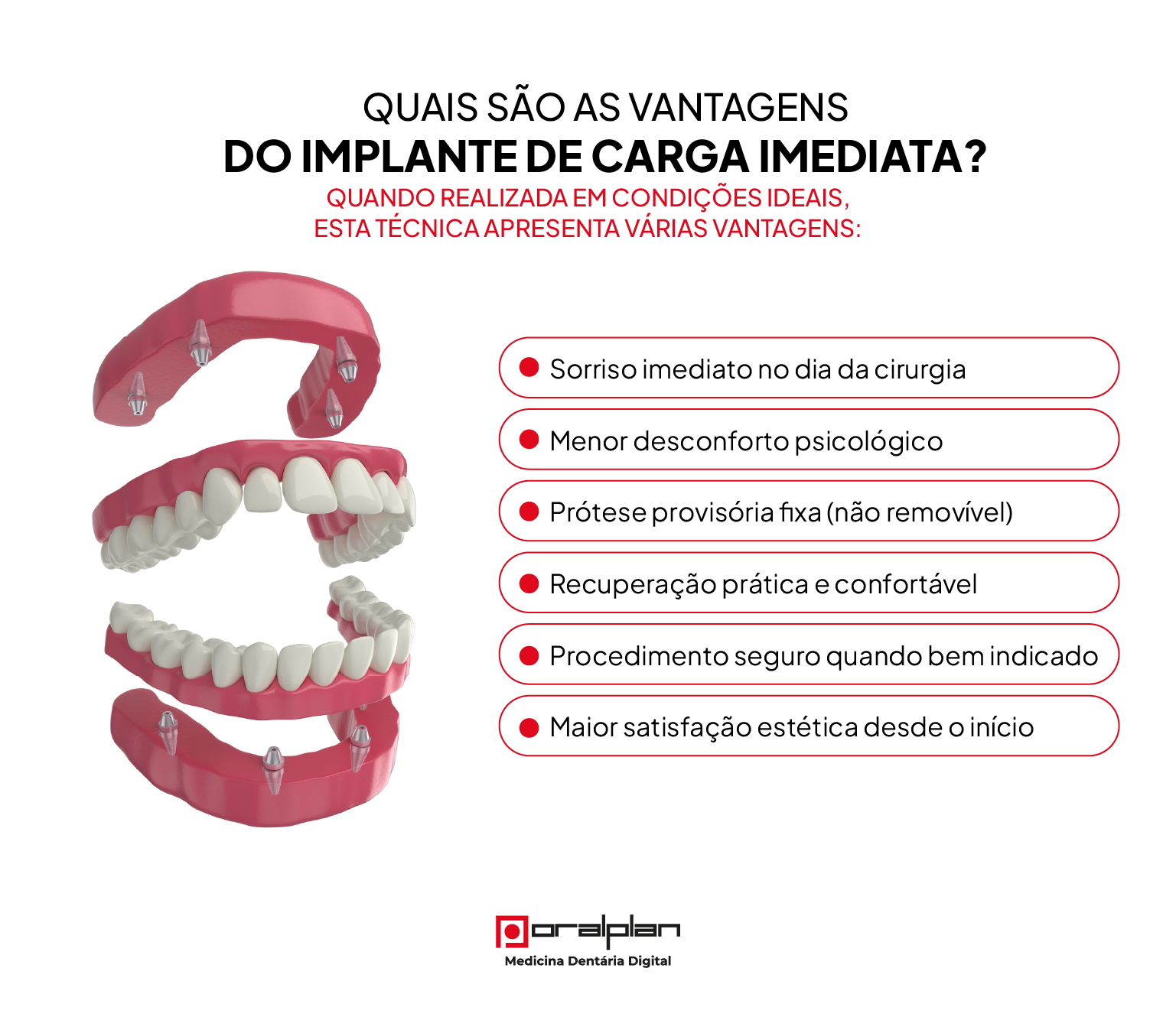 A grande vantagem da carga imediata é devolver a estética completa do sorriso no primeiro dia, de forma previsível e confortável.