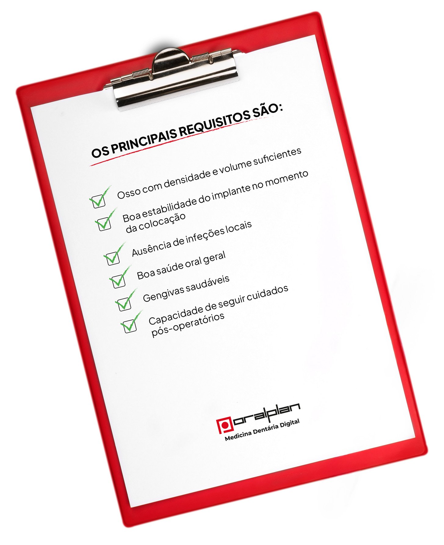Os principais requisitos incluem ter osso com densidade e volume suficientes, garantir uma boa estabilidade do implante no momento da colocação, não apresentar infeções locais, manter uma boa saúde oral geral, além de ser capaz de seguir corretamente os cuidados pós-operatórios.