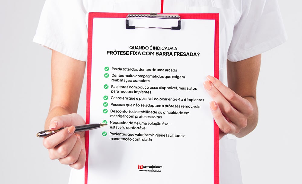 Este tipo de prótese é recomendado sobretudo para pessoas que perderam todos os dentes de uma arcada, ou que têm dentes muito comprometidos e precisam de uma reabilitação completa. Nestes casos, a barra fresada permite transformar um conjunto de implantes numa estrutura sólida e estável, ideal para suportar uma prótese fixa.