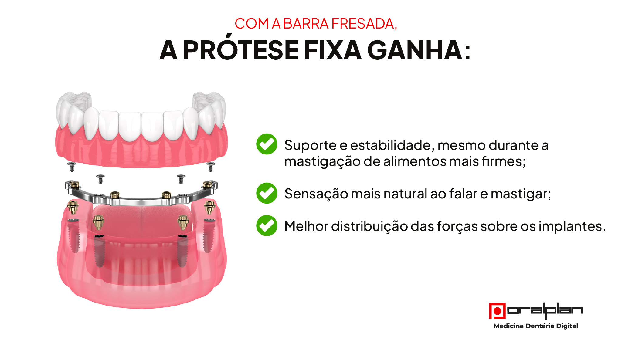 A barra fresada é uma estrutura rígida, produzida com tecnologia digital, que une todos os implantes e serve de base para uma prótese fixa. Esta barra é fabricada por máquinas de fresagem computadorizadas, garantindo assim um ajuste perfeito aos implantes e à anatomia do paciente. A barra fresada dá suporte, estabilidade e conforto à prótese fixa e permite que a sensação ao mastigar e falar seja o mais natural possível.