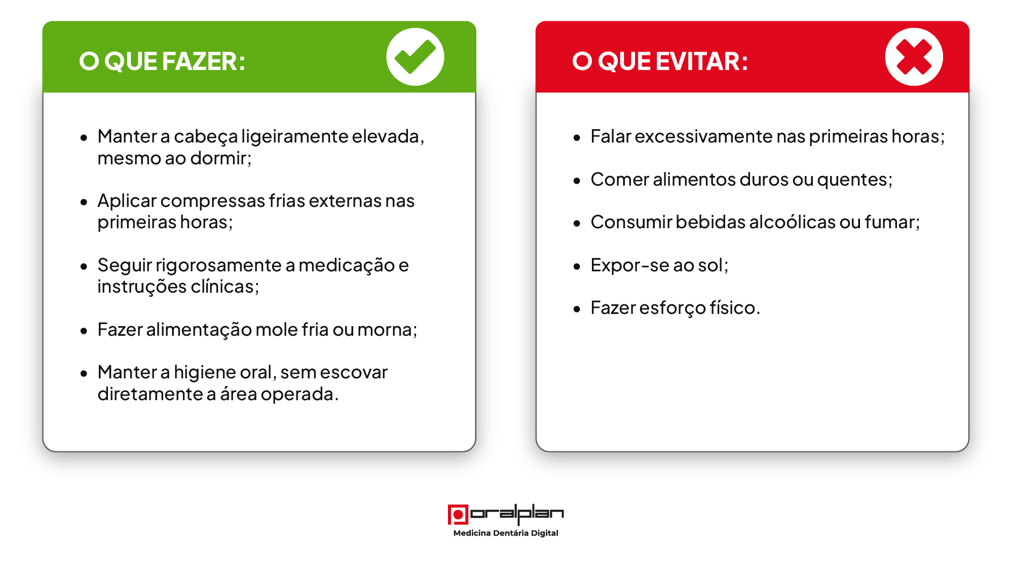 Deve contactar a clínica caso surjam sintomas como dor intensa que não melhora com a medicação, febre acima de 38ºC, mau sabor persistente na boca, sangramento contínuo ou inchaço que aumenta após o terceiro dia.